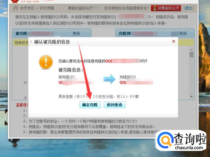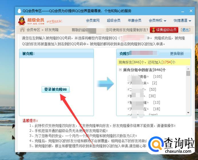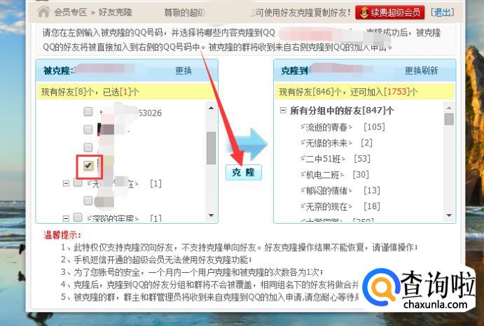 登陆之后,勾选需要克隆的好友,点击“克隆”,如图所示。