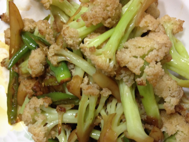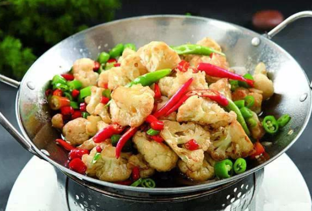 买来的菜花掰开,锅内烧开水,水沸腾后把菜花倒进去,捞出来控控水。开火,把锅内的水分烧干,放油,放花椒粒。把菜花一次性倒进去,翻炒,放盐,加入半勺清水,烧开后,再翻炒几下,就可以关火,装盘了。