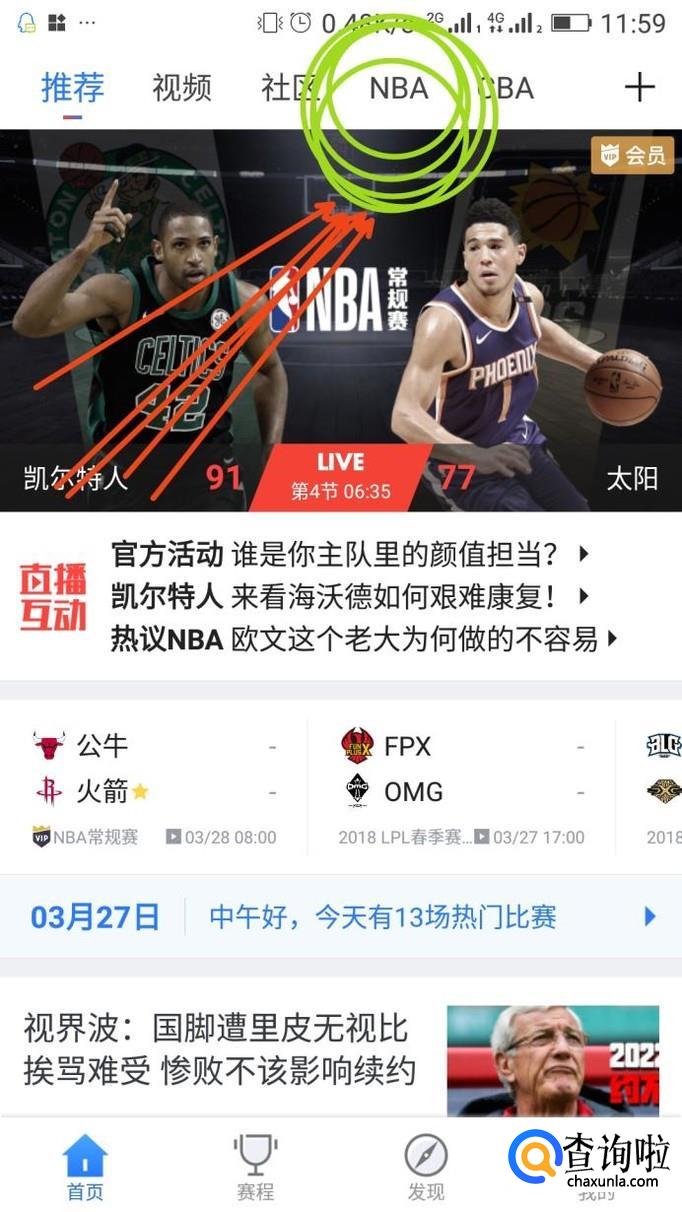 在首页点击“NBA”专区。就可以看到正在直播的各项nba赛事了