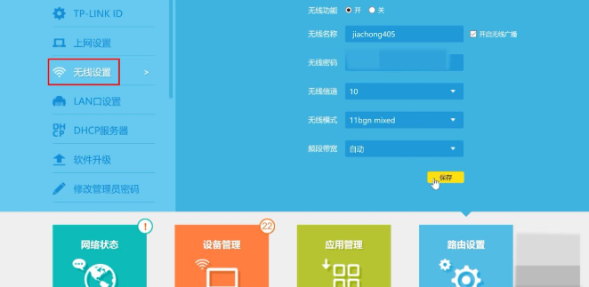 3、接着点击左侧的上网设置,WAN口连接类型选择自动获得IP地址,点击保存,然后切换到无线设置,输入无线名称和无线密码,点击保存。