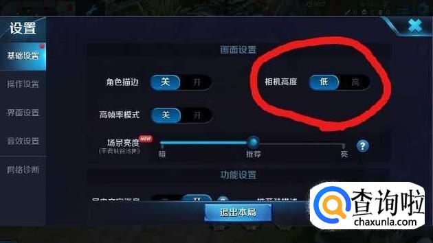 弹出设置页面,点开基础设置,里面有一个相机高度,我们调节它成低。