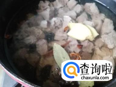 开大火熬煮牛肉,水沸腾后将生姜、香叶、黄酒、八角、花椒放入,转中火煮1个小时。