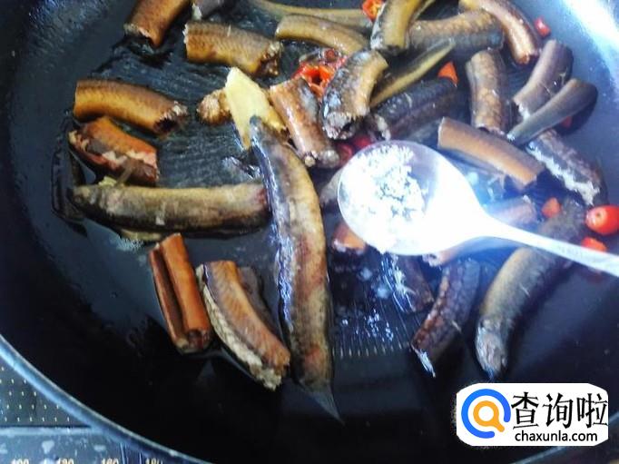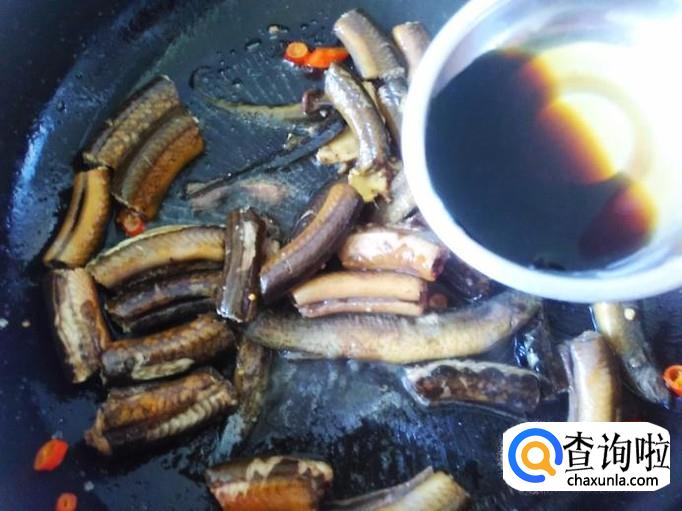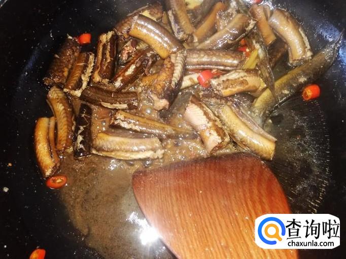 黄鳝下锅,加适量的盐翻炒一下,再下1勺生抽、1勺料酒。
