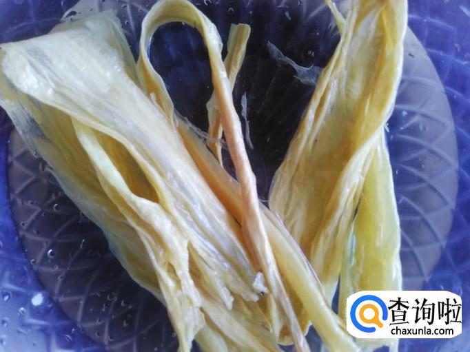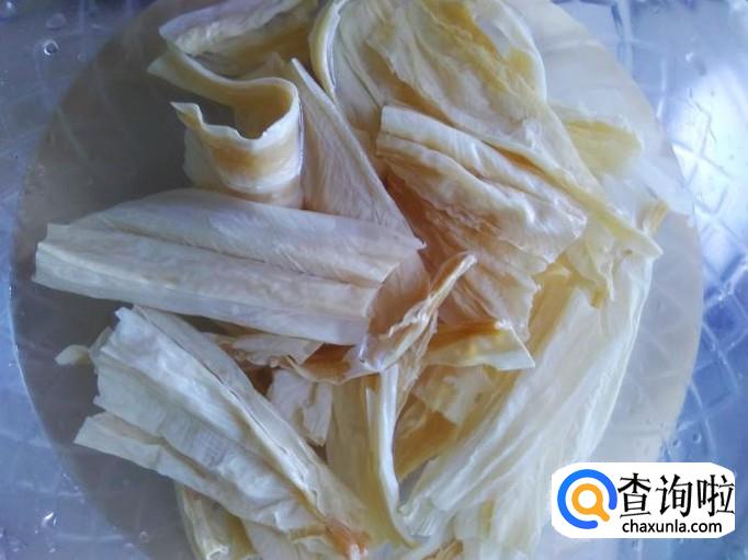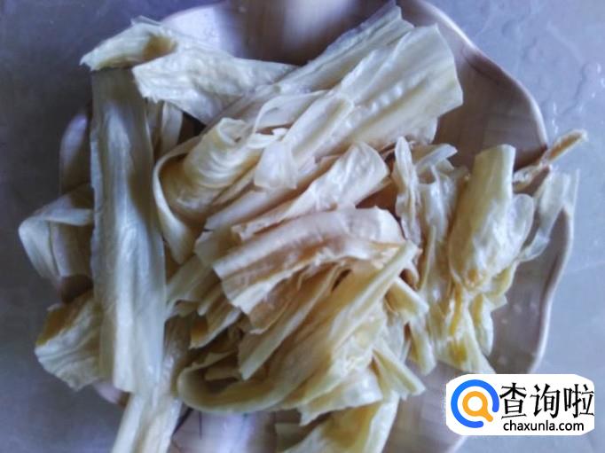 腐竹用冷水泡软,然后用剪刀剪成一段段。