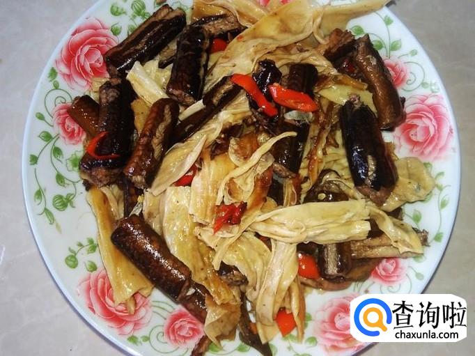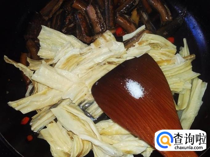 翻炒入味,然后下腐竹加少量的盐花翻炒。