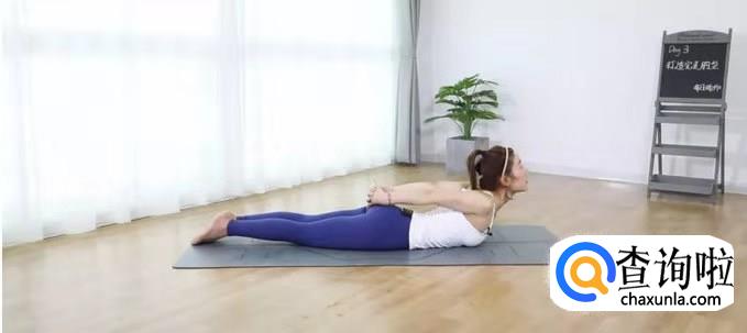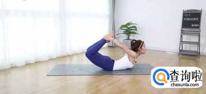 俯卧,然后弯曲膝盖,双手抓住脚踝外缘,吸气,上提胸腔肩膀,呼气,双腿向后有力。抬起头,眼睛凝视前方,保持5个呼吸。