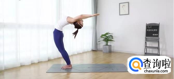 双腿分开站立与髋同宽,双腿伸直不要弯曲,腹部收紧;双手向上举过头顶,十指紧扣,慢慢吸气,呼气手臂带动身体向斜后方伸展。眼睛看向手指的方向,将胸腔完全打开。