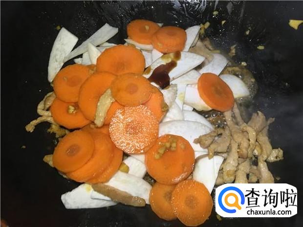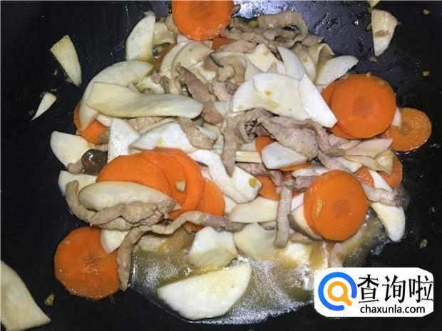 然后把鸡腿菇和红萝卜一起倒入锅中,加入适量的蚝油,翻炒均匀,再加入少许清水,盖上锅盖焖10分钟,焖熟的鸡腿菇就变软了,吸收了瘦肉的香味,非常好吃。