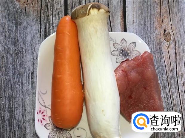 准备好所有食材:红萝卜一根、鸡腿菇一根、瘦肉适量,这个分量足够两个人吃的了。