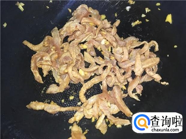 热锅下油,放入姜片煸香,然后倒入腌制好的瘦肉,把瘦肉翻炒到变颜色,大概炒3分钟左右。