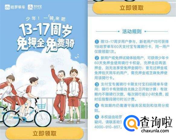 这是支付宝针对少年(13-17岁)赠送一张60天的骑行券。能免费骑行60天! 只要你年龄在13-17周岁,就可以领取这张60天免费骑的卡,免费骑行啦。