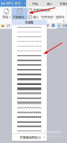 然后我们点击左边的“页眉横线”按钮,就会弹出菜单,我们选择喜欢的横线。