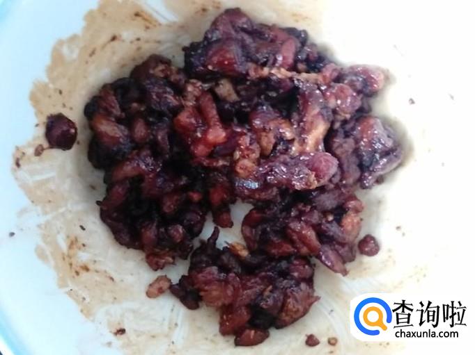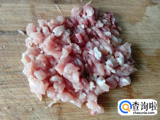 然后把瘦肉剁成肉酱,拿个碗装好,倒入酱油,食盐等调味料来腌制一会儿。