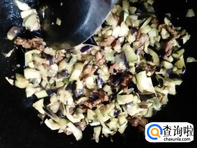 锅中放油,先倒入瘦肉,然后倒入茄子末翻炒,加入一点水,多放一点食盐,毕竟是作为卤料。