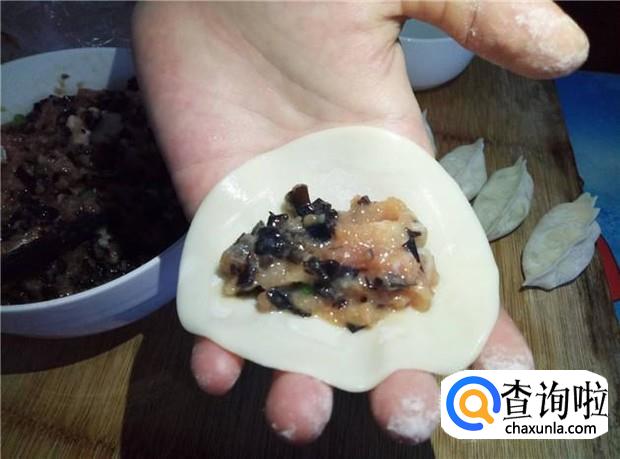 用手指沾水,绕着饺子皮一圈,先把饺子皮边缘给弄湿,然后放入馅料,然后开始捏。