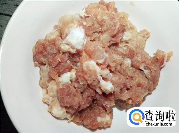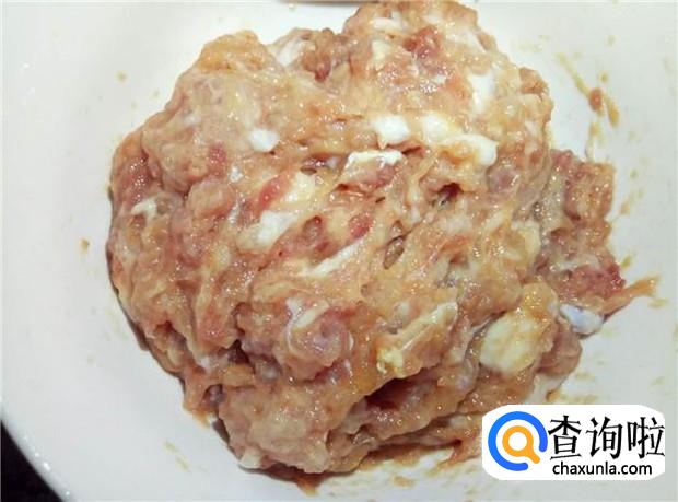 搅碎好的肉沫加入适量的花生油、酱油、盐,腌制一会,腌制的过程中,可以把肉沫放冰箱冻一会,这样肉沫变得更加黏糊。