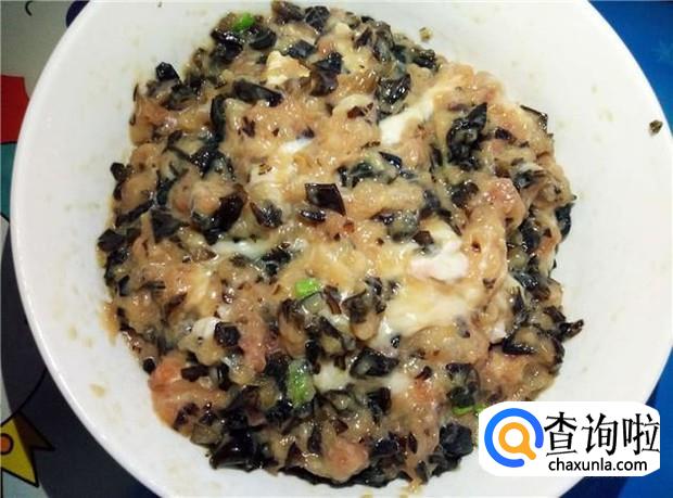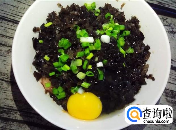 把木耳、葱末、鸡蛋一起加入肉沫中,再加入适量的盐,再次搅拌均匀。