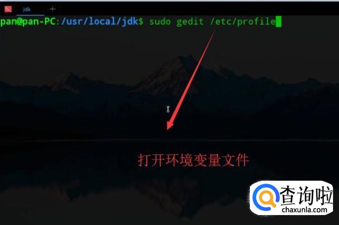 接着执行sudo gedit /etc/profile命令打开环境变量文件,如下图所示