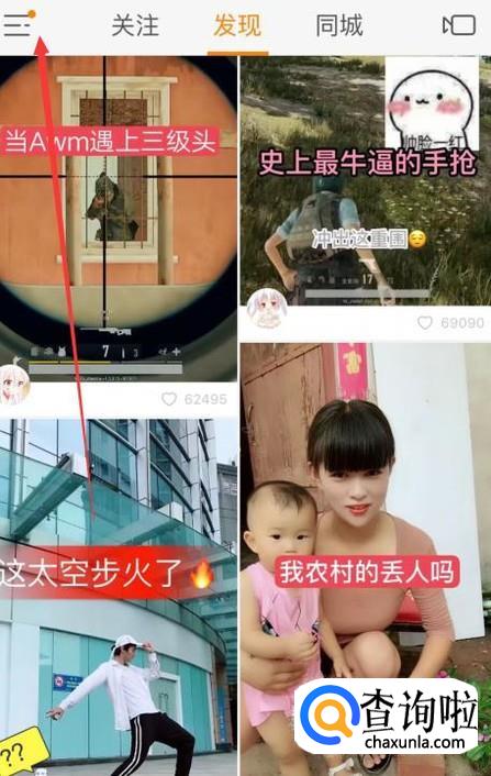 首先登录到快手的界面,在左上方有一个符号,然后点开,如下图
