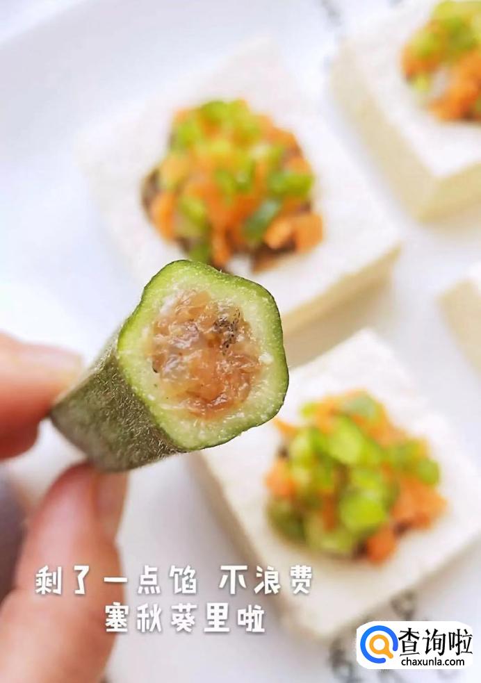 如果大家的馅做多了,可以把这部分线塞到秋葵里面蒸一下或者炸着吃也是非常不错的。另外,你们也可以把多出来的馅做成肉丸煮汤,也是一个不错的选择。