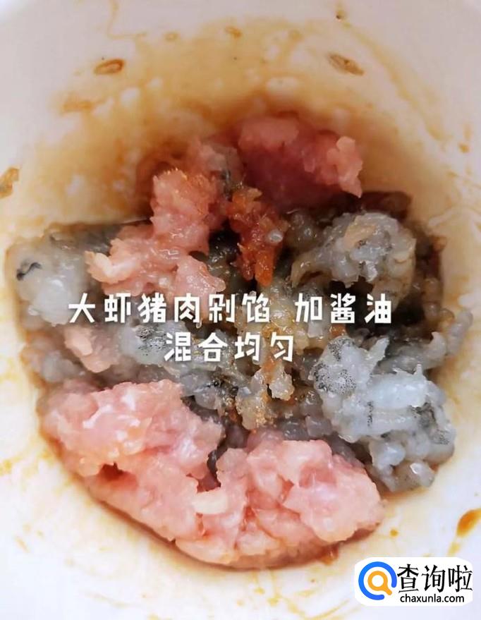 然后把虾仁剁成馅,猪肉剁成馅,倒入一个碗中,加入适量的酱油,搅拌均匀,如下图所示。小贴士:1.猪肉最好选择里脊肉会比较好;2.如果大家觉得剁馅比较麻烦,可以把虾仁和猪肉一起放入搅拌机搅碎就可以了。
