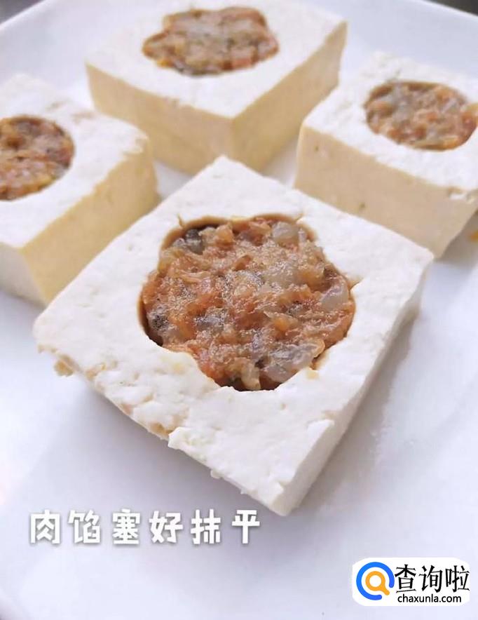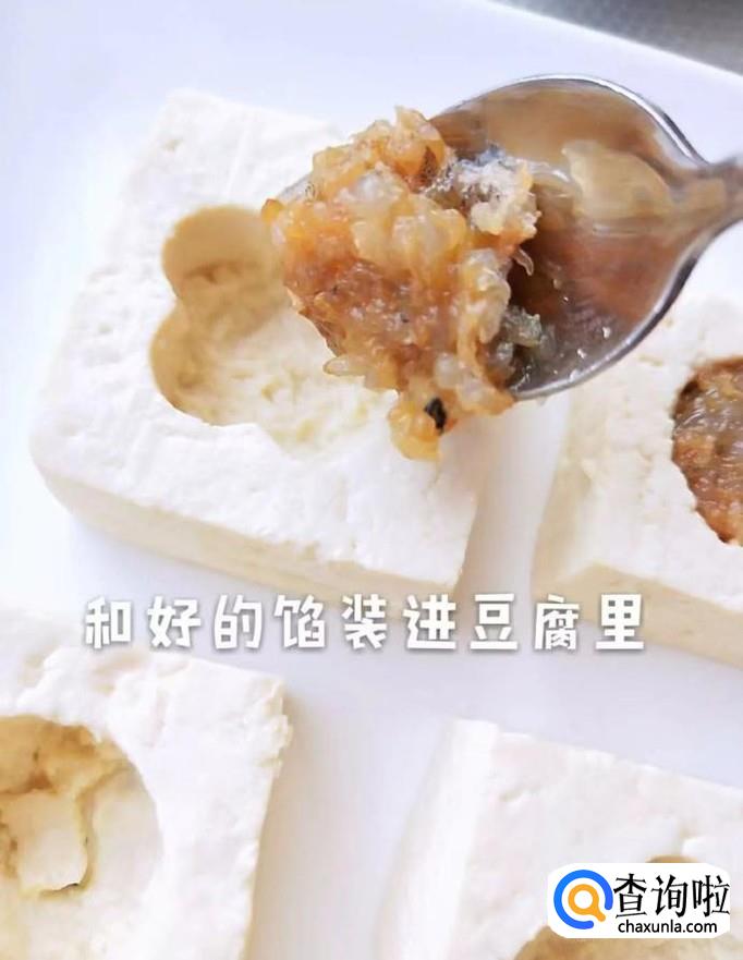 接着用勺子把馅装进豆腐里面,如下图所示。小贴士:豆腐比较嫩很容易破,所以大家在塞馅的时候动作要轻。