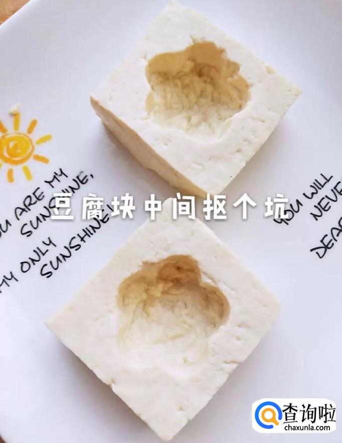 首先将豆腐洗干净,中间用模具挖出一个坑,如下图所示。小贴士:如果大家家中没有模具,可以用勺子挖出一个洞也是可以的。