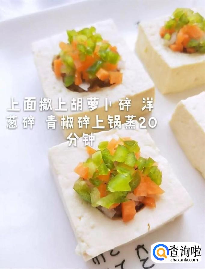 然后在豆腐的表面放上胡萝卜,说洋葱碎和青椒,说上锅蒸20分钟,如下图所示。