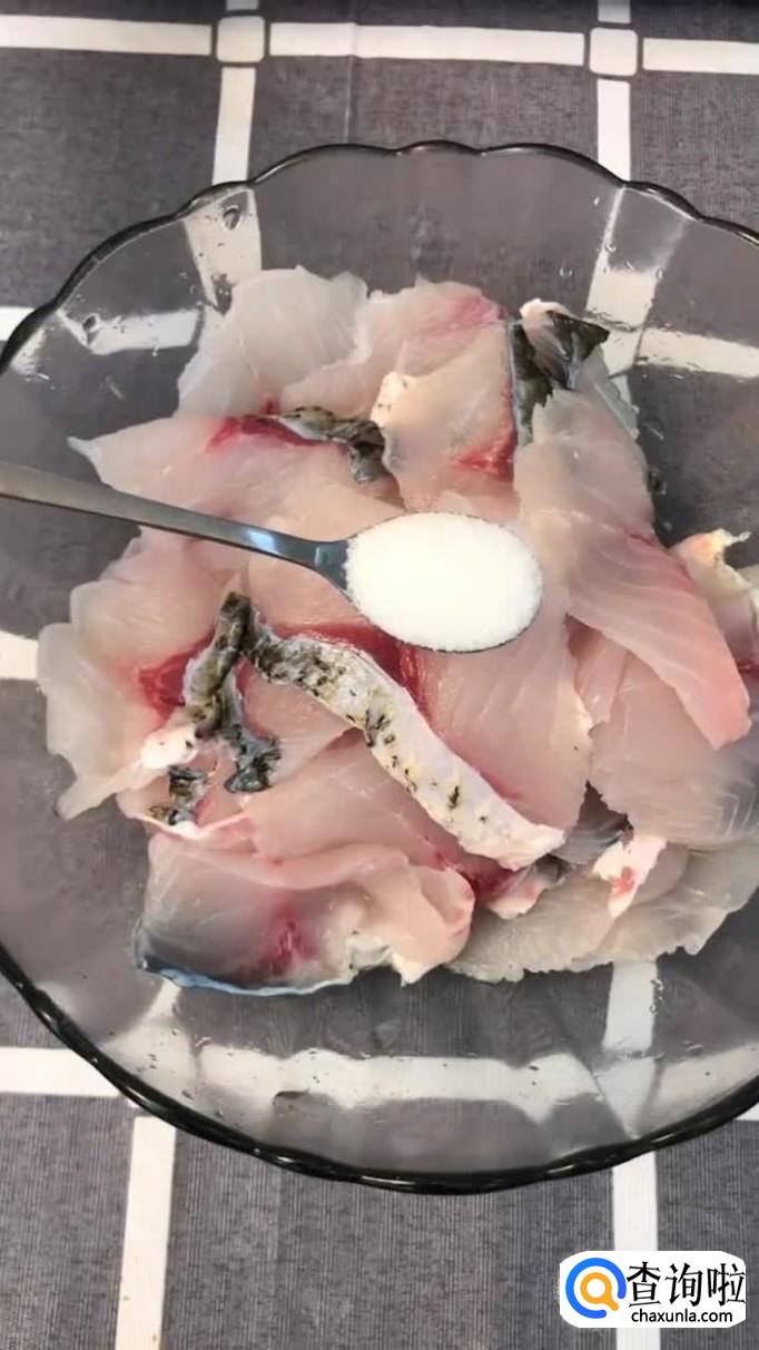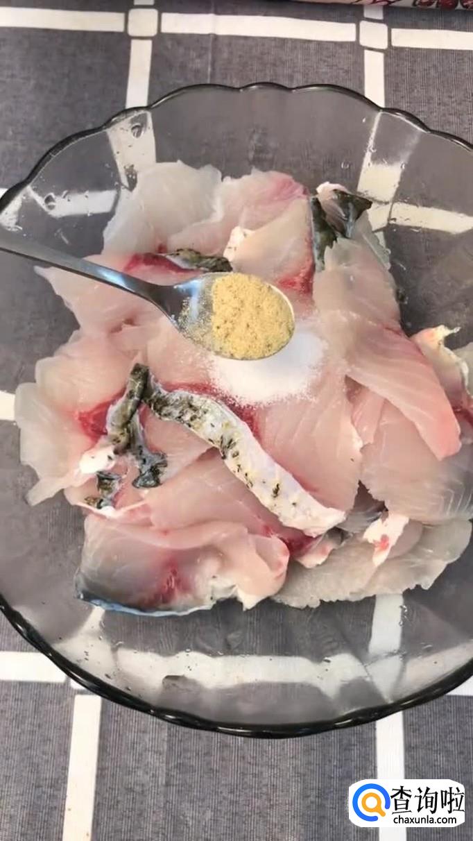 接着加入适量的盐,十三香和料酒把鱼肉抓匀,如下图所示。