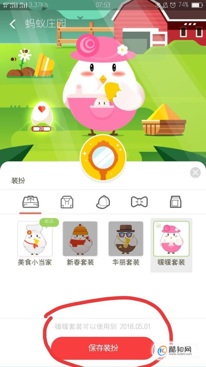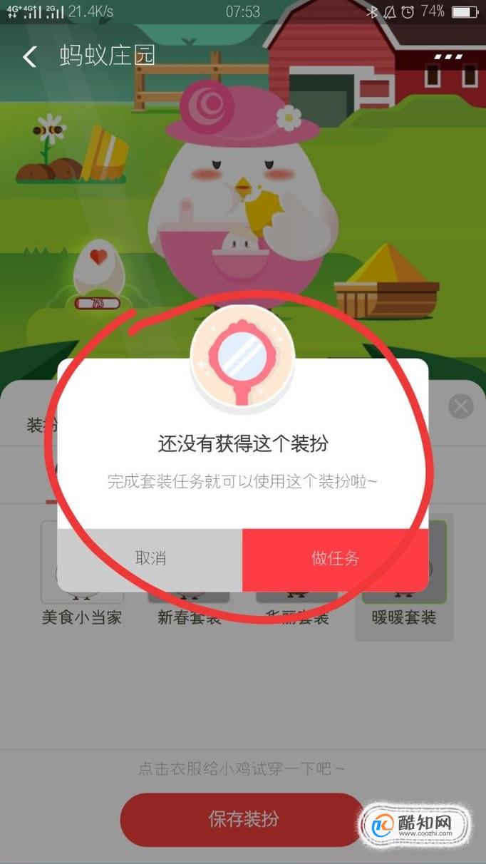 目前蚂蚁庄园是有四种衣服装扮样式,根据自己的喜爱,选择一个想要的样式,点击保存装扮,会提示:还没有获得这个装扮,需要我们做任务才可以使用这个装扮,然后点击开始做任务。