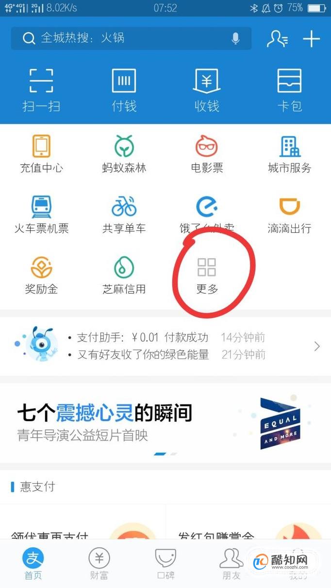 在支付宝的首页面中,找到“更多”的图标样式,然后我们点击进入操作。