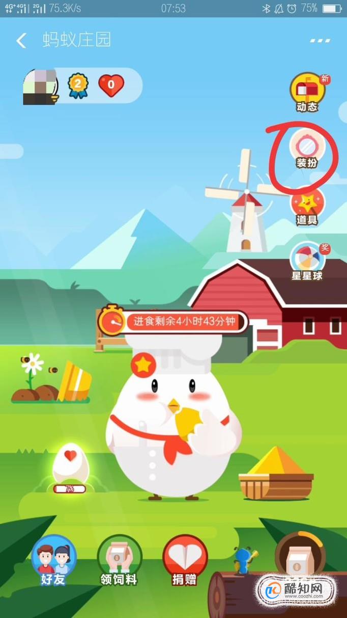 如下图所示内容就是我们蚂蚁庄园的页面,然后点击右上角有一个装扮字样。