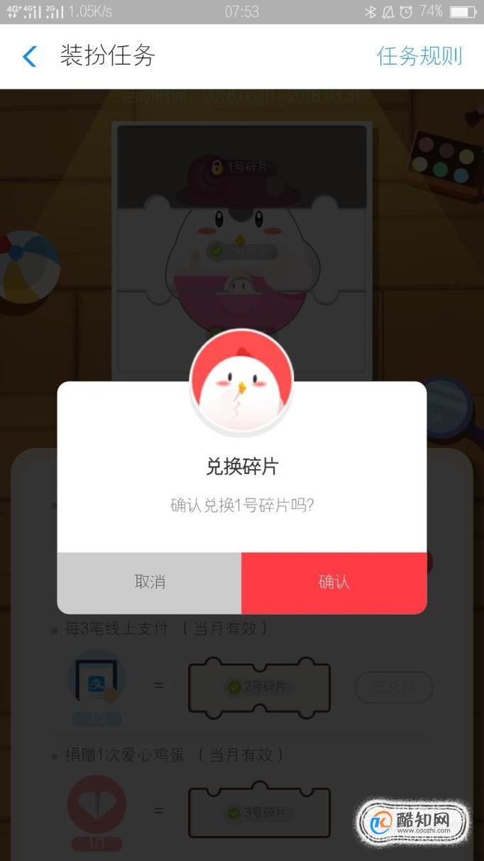 根据提示开始做装扮任务,首先兑换1号碎片,点击确认兑换碎片,总共是有三个碎片,因为我后面两个碎片已经获得了。其实操作给我们兑换一号碎片是一样的。