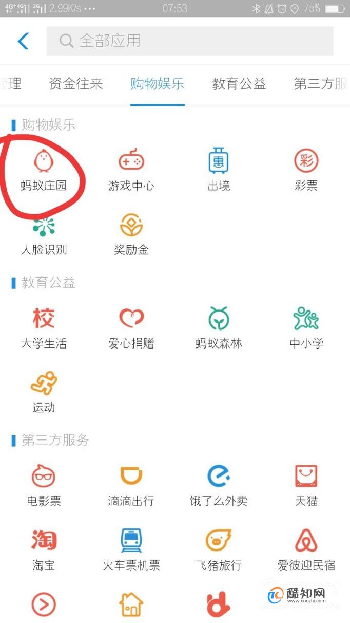 在购物娱乐中找到“蚂蚁庄园”的样式,点击进入庄园。