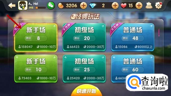 在“经典玩法”的模式下,有很多个场次;我们选择第一个“新手场、不洗牌”,点击;