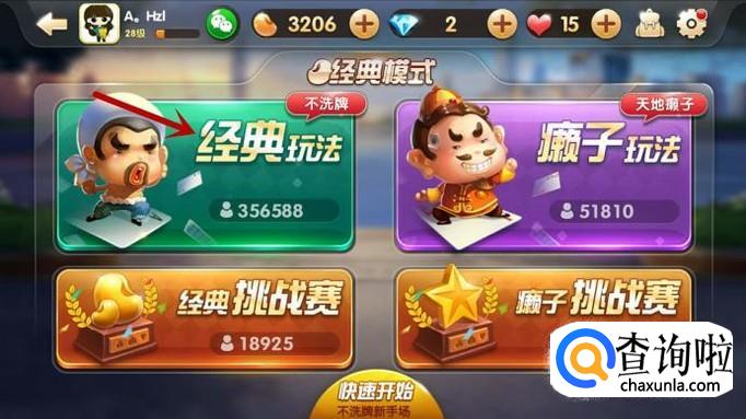 在“经典模式”的界面,有四种玩法,分别是“经典玩法”、“经典挑战赛”、“癞子玩法”、“癞子挑战赛”;我们选择“经典玩法”,点击;