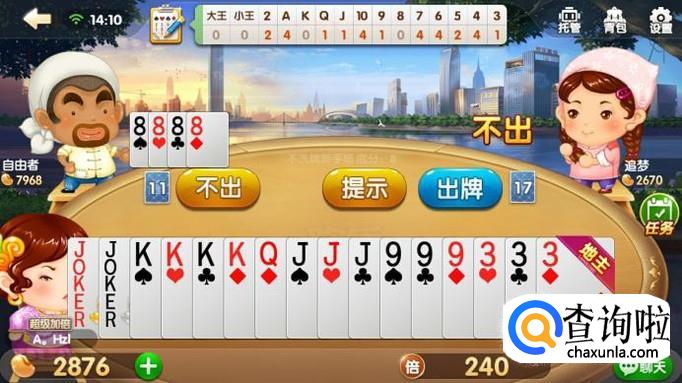 出牌的时候,我们可以出一样的,比如“对五”;如果你一开始出的是对子(两个一样的数字的牌),那么另外两个玩家也要出对子,而且要比你的牌大;如果没有或者不想出,都会显示“不出”;