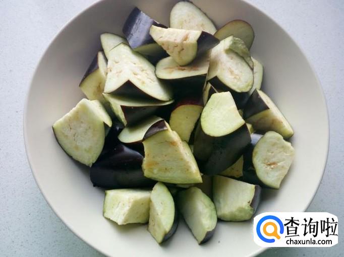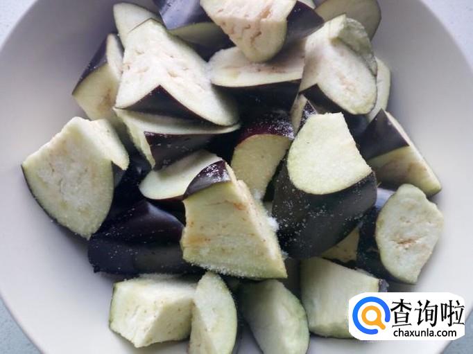 茄子用水清洗干净,切成块,放入一匙儿盐,腌制10分钟。
