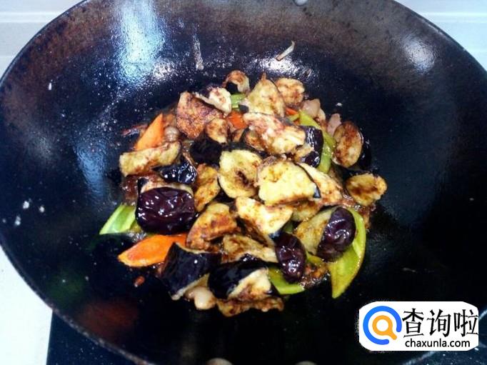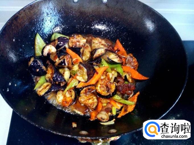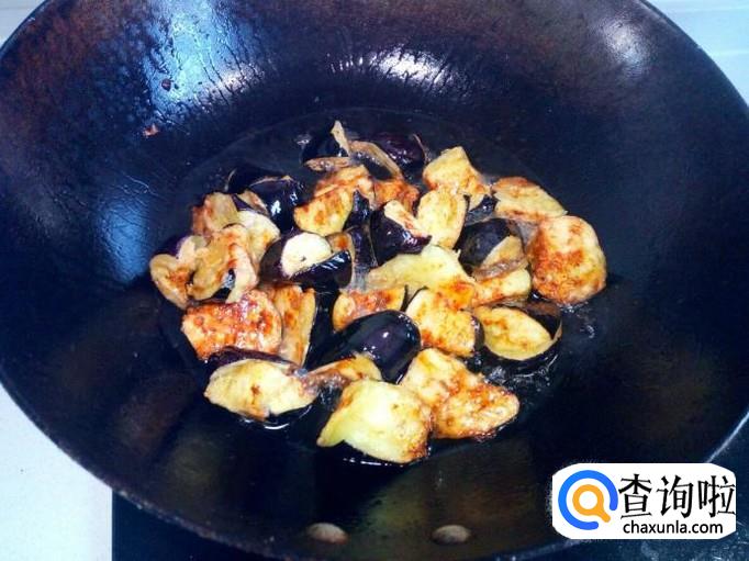 把炸好的茄子放入锅中,颠勺翻个,然后把勾兑好的芡汁,倒入锅中。