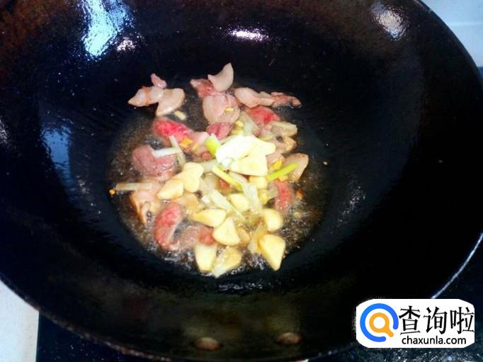 把炸茄子多余的油盛出,锅内留少许油,放入肉翻炒,然后放入葱,姜,蒜。