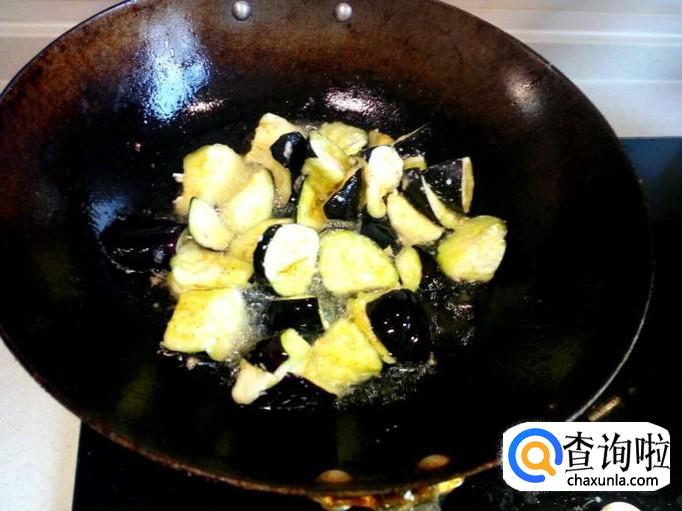 锅内放入比平时炒菜多一些的油,加热(腌制后的茄子不会很吃油),油热后放入茄子油炸一下,炸至两面焦黄,盛出备用。