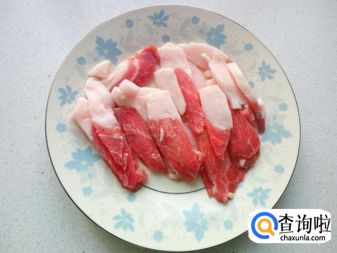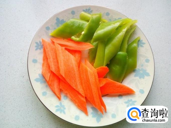 五花肉切成片。青尖椒,红萝卜用水洗净,切成片,备用。