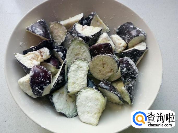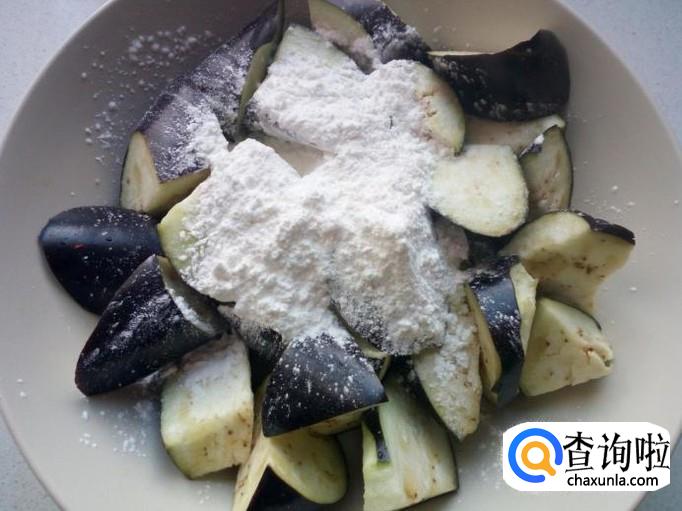 把腌制好的茄子,用手挤压一下,然后倒掉腌制下来的水分,放入淀粉,用手抓匀。