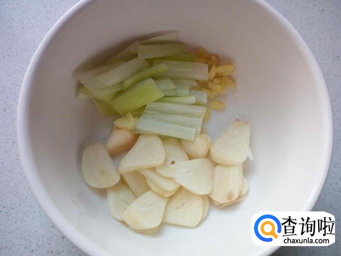 葱,姜切丝,蒜切片。碗中放入少许淀粉,兑水,勾兑成芡汁,备用。