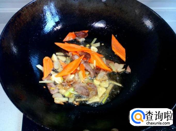放入胡萝卜炒至变软,放入尖青椒略翻炒一下,然后放入料酒,白糖,少许醋,五香粉,酱油,盐,味精,烧成汁。