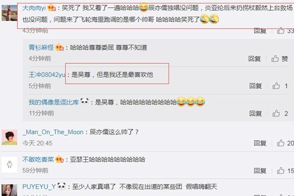 辰亦儒这个意思就是说,我独唱没有问题啊,跑调的肯定是汪东城和吴尊。听说后来炎亚纶扔掉拐杖上去救场也没有跑调,那么既不是辰亦儒,也不是炎亚纶,就剩下吴尊跟汪东城了。有网友回应说:“是吴尊,但我还是很喜欢他。”其实不论是谁,他们都没有怪罪对方的意思。