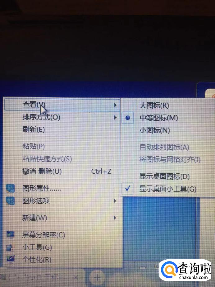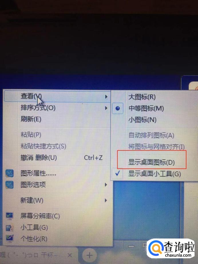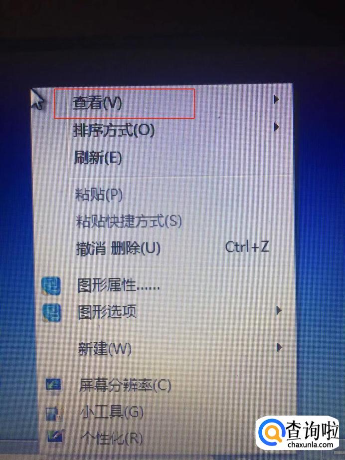 在出现的菜单里面,我们将鼠标移动到“查看”这个项目,然后我们找到“显示桌面图标”。