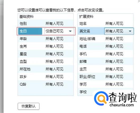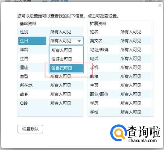 点击生日后面的选项,找到“仅自己可见”,见下图