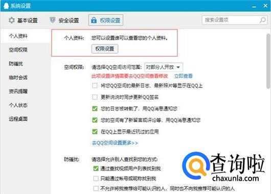 点击权限设置,选择“个人资料权限设置”,见下图