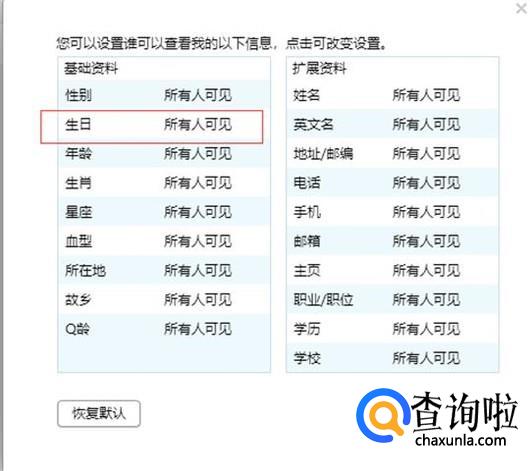 点击个人资料权限设置,找到“生日”,见下图